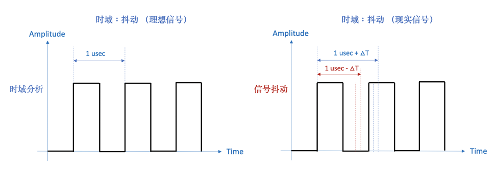 晶振的短期频率稳定度由噪声引起导致的频率不稳定。其中,电噪声是根本原因。电噪声包括热噪声,散弹噪声,以及闪变噪声。导体的无规律热运动带来热噪声。从频域来看,对应的参数是相位噪声(Phase Noise);从时域来看,对应的参数是抖动(Jitter)。时间和频域之间的关系互为倒数Time=1/Frequency。